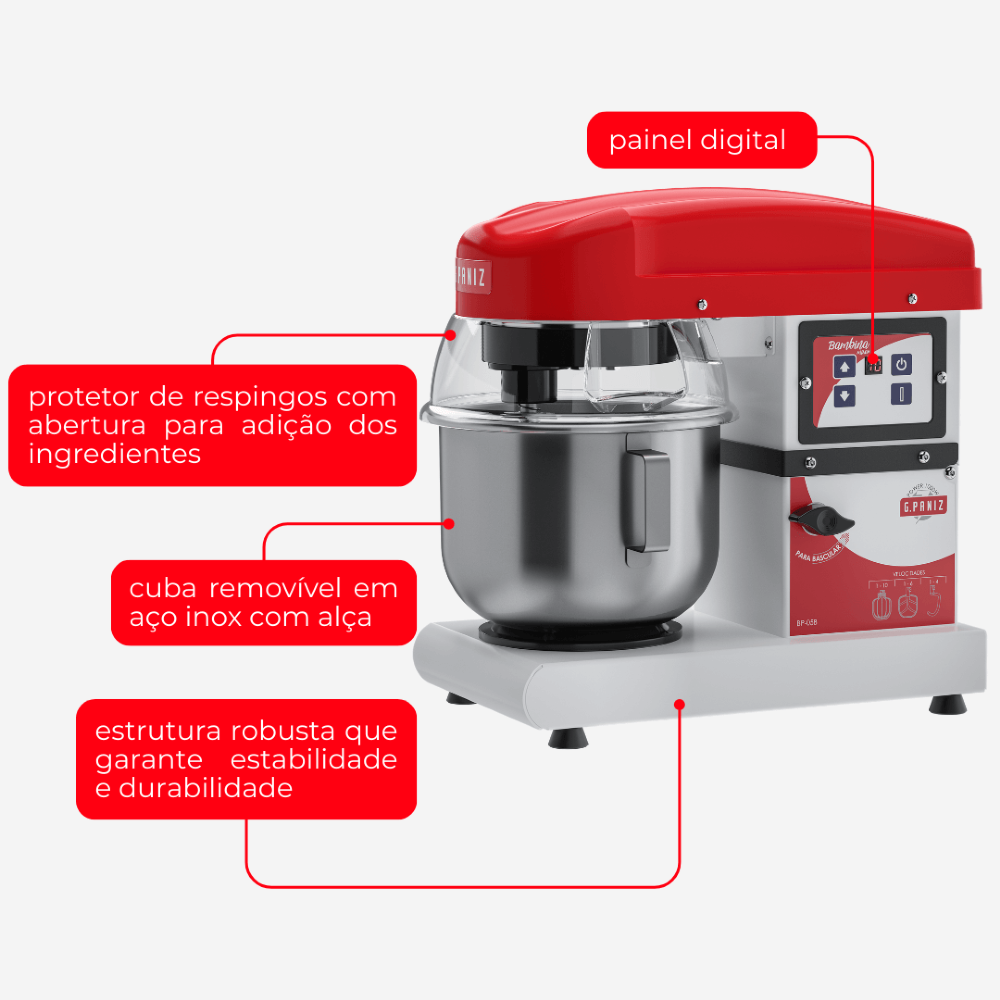Esta batedeira é projetada para atender as necessidades de panificadoras e confeitarias de pequeno e médio porte. É ideal para preparar desde massas leves até cremes e glacês, adaptando-se facilmente a diferentes necessidades culinárias. Os materiais de alta qualidade utilizados em sua fabricação garantem uma longa vida útil, enquanto os componentes removíveis facilitam a limpeza. A praticidade em seu manuseio promove um ambiente de trabalho sempre limpo e organizado.