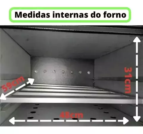 – Dimensões Internas do Forno: Altura: 31 cm – Largura: 48 cm – Profundidade: 59 cm